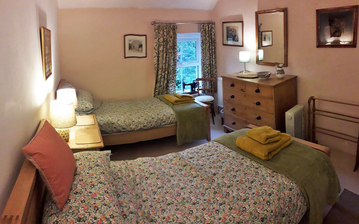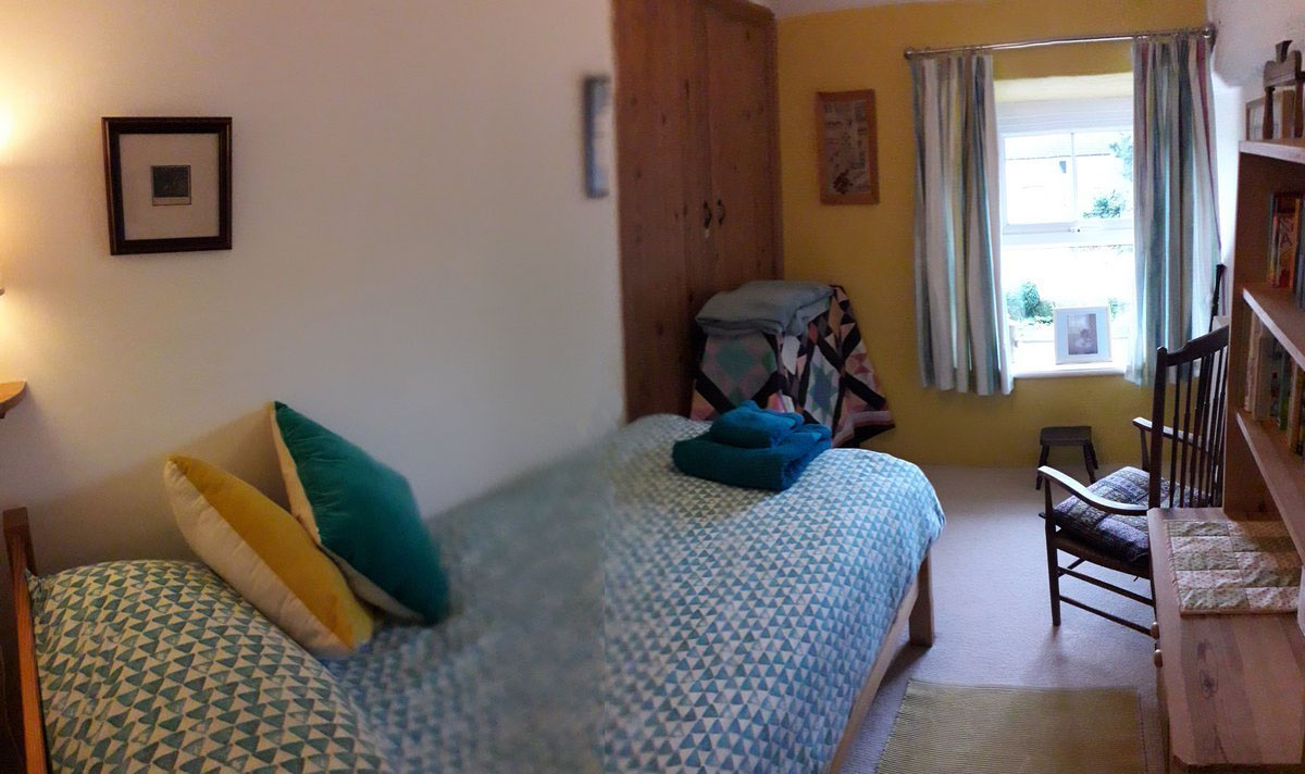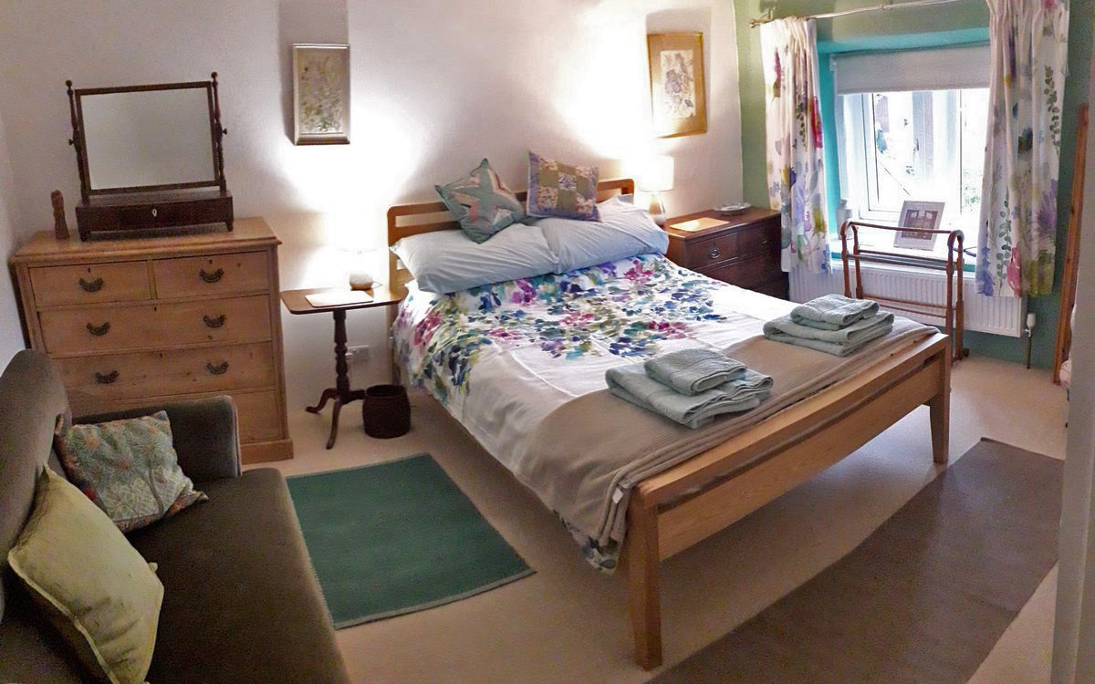 The main bedroom is a good size with double bed, built in wardrobe, chests of drawers and a sofa. The view is through original stone windows on to the pretty front garden. It has fitted carpet and rugs.
