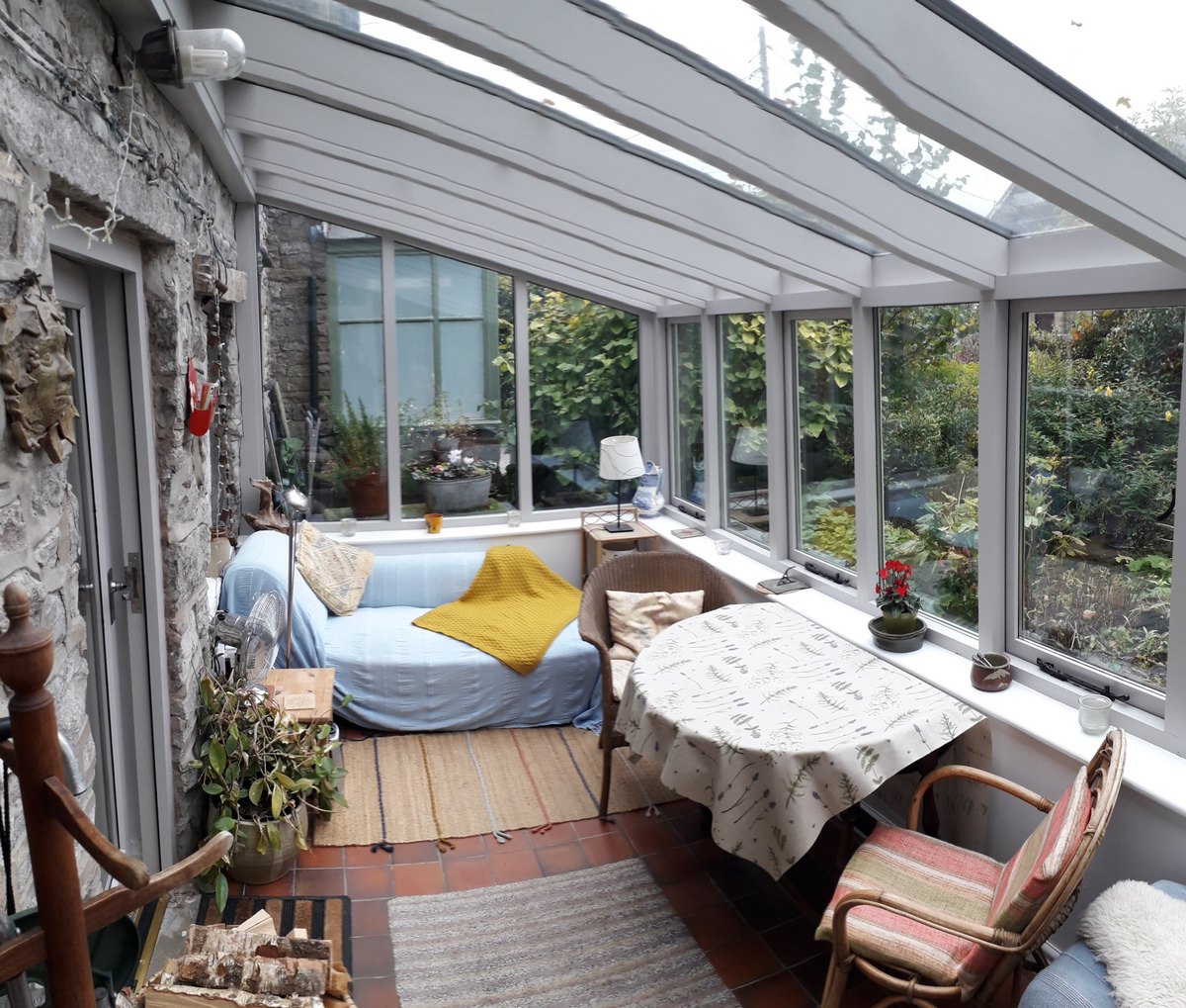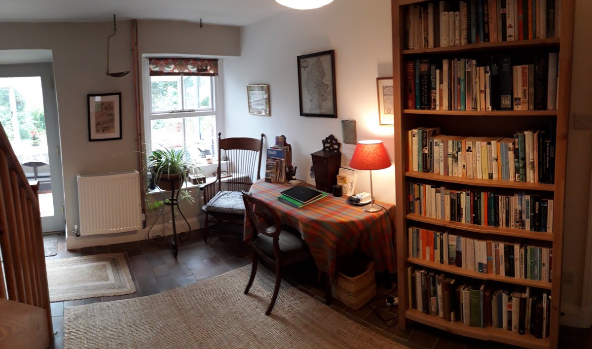 Entrance to the cottage is via the handbuilt, wooden, double-glazed conservatory measuring 18 feet long. It offers an immediate warm space not only to come into and to gather yourself before going out, but also affords a really pleasant place to sit, read and observe the garden with many wild birds on the feeders. It has a chaise longue and comfortable chairs round a table and an ottoman, very useful to sit and get walking boots on and off!