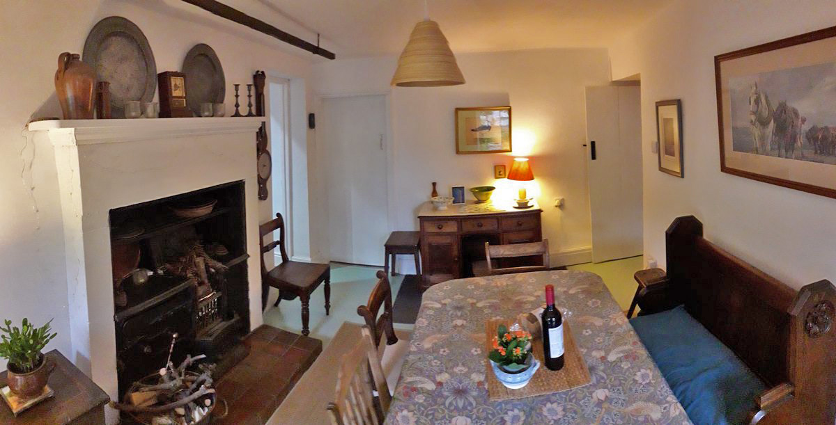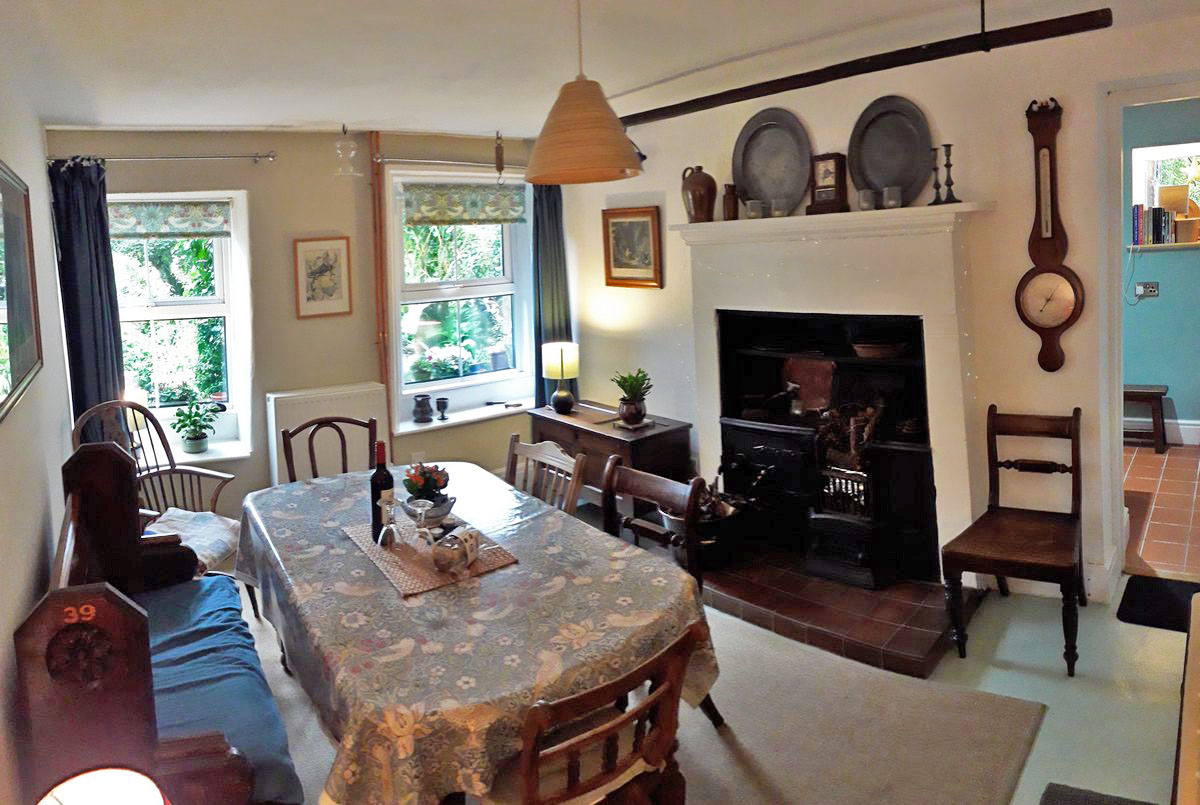To the other side of the hall is the dining room. This is again a charming, spacious room and has has a really original feel with its Victorian black iron range [not in use] in the original cottage fireplace and stone mantelpiece. A full dining table easily provides seating for six people.