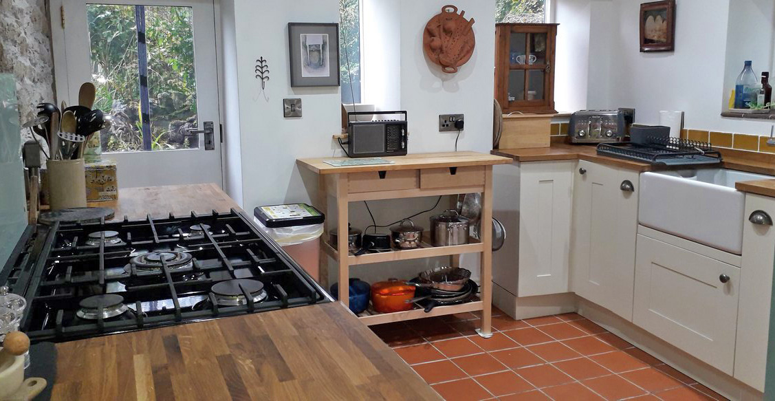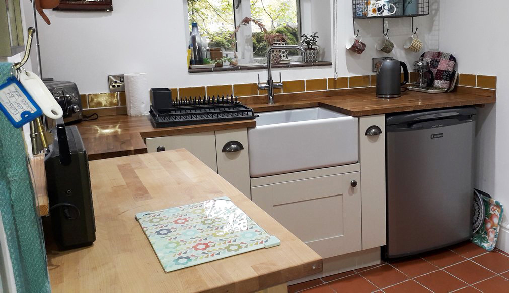 Beyond the dining room is the recently converted kitchen. This is a light and airy room with tiled floor, shaker units, wooden worktops, Belfast sink, dual-fuel Smeg range cooker (electric oven and gas hob) and fridge. It is extremely well equipped with cooking utensils and pans (inlcuding Le Creuset casserole pans, a paella pan and wok) should you wish to cook your own meals from scratch and we provided a range of herbs spices, oils and other provisions.