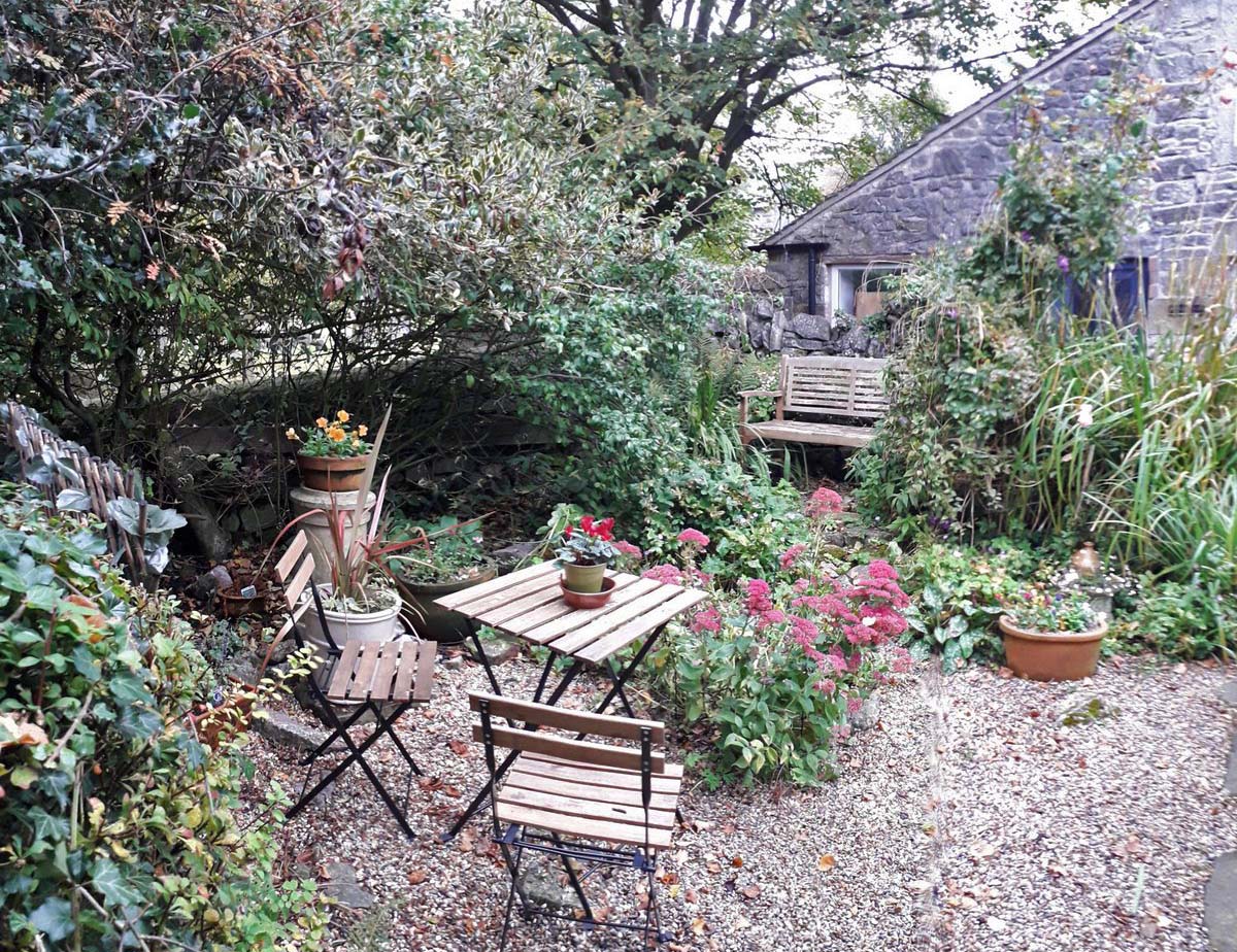 Charming enclosed cottage garden, patio and garden furniture with anchor plate chain bike lockup.